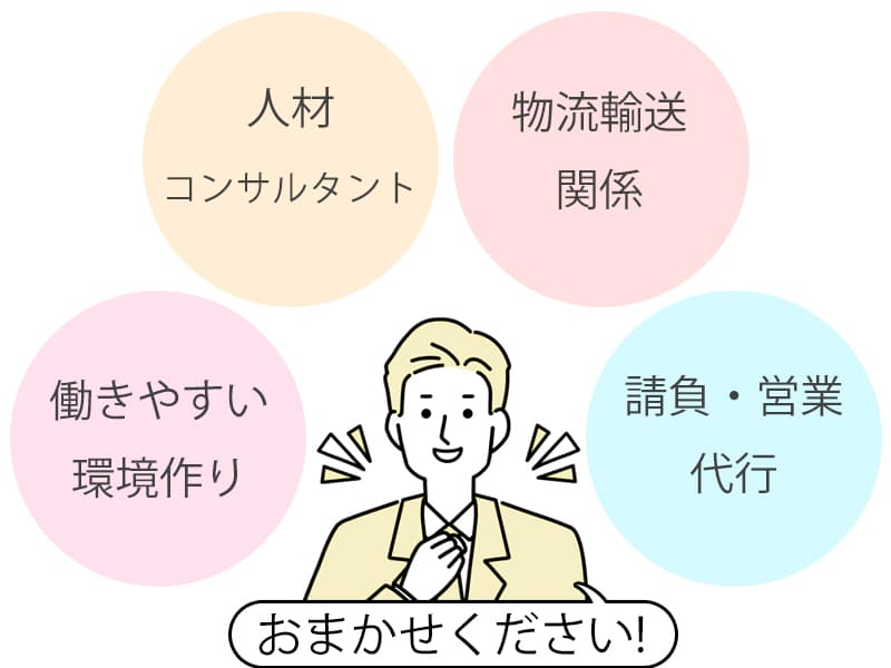 また弊社は、物流輸送に関する、保管・荷役・包装・流通加工・情報といった物流の基本活動をお手伝いさせていただきます。人材コンサルタント業を通して、物流倉庫の請負から営業代行まで、幅広く物流人材業界に特化した事業提案で顧客満足度を高め、ビジネスパートナーとして共に成功へ導きます。